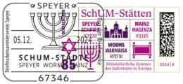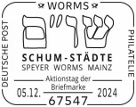 Am 5. Dezember 2024 erscheint die neue Sonderbriefmarke zu den SchUM-Städten. Diese Marke würdigt die historische Bedeutung der Städte Speyer, Worms und Mainz, die seit dem Mittelalter als Zentren jüdischen Lebens und bedeutende Stätten der Kulturgeschichte bekannt sind. Die SchUM-Städte prägten durch ihre religiösen, rechtlichen und kulturellen Errungenschaften das europäische Judentum nachhaltig. Ihre Bedeutung wurde 2021 durch die Aufnahme in die UNESCO-Welterbeliste weltweit anerkannt.