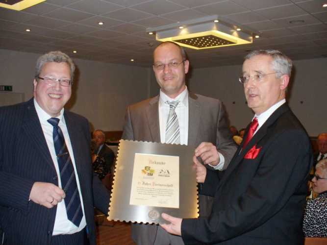 Peter Kuhm überreicht die Partnerschaftsgabe an die Messeleitung