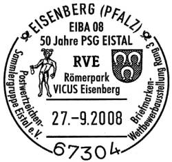 187 Rahmen werden mit Exponaten von jung und alt in den Ausstellungsklassen Thematik, Postgeschichte und Ländersammlungen bestückt und präsentieren damit der Öffentlichkeit ein breites Spektrum unseres schönen Hobbys. Höhepunkt der Veranstaltung wird der Festabend am Samstagabend im Gasthaus "Zum Engel" (gegenüber vom Storchenturm) sein. Extra zur Ausstellung wird es einen Sonderstempel geben, der eine Statue zeigt, die den römischen Gott "Merkur" darstellt, die in Eisenberg gefunden wurde. Ferner wird es einen thematisch passenden Beleg extra zur Ausstellung geben. Daneben können auch noch weitere Belege von früheren Veranstaltungen des Vereins gekauft werden. Eisenberg ist über die A 6 (Ausfahrt Wattenheim) und die A 63 (Ausfahrt Göllheim) sowie mit der Bahn (Regionalbahn ab Frankenthal Hbf) gut zu erreichen. Nähere Auskünfte erteilt: Kurt Mattheis, Stauferstr. 6, 67304 Eisenberg, Tel. 06351/42206 |