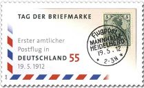 Dieses für Deutschland in mehrfacher Hinsicht bedeutende Ereignis hatte der Bund Deutscher Philatelisten (BDPh) zum Anlass genommen, dem Bundesminister der Finanzen vorzuschlagen, das Sonderpostwertzeichen der Serie „Tag der Briefmarke“ im Jahr 2012 diesem Thema zu widmen. Am Donnerstag, den 13. September 2012, wird nun das neue Sonderpostwertzeichen Deutschlands zum „Tag der Briefmarke 2012“ im Flughafen Mannheim offiziell übergeben. Veranstaltungsort der zentralen Veranstaltung des BDPh, die er gemeinsam mit seinen beiden Vereinen „vor Ort“ aus Mannheim und Heidelberg durchführt, ist der Rhein-Neckar Flugplatz, Seckenheimer Landstraße 172 in 68163 Mannheim. Die Markenpräsentation erfolgt im Empfangsgebäude des Flugplatzes am 13. 9. 2012 um 11:00 Uhr. Die Gesamtveranstaltung findet von 9:00 bis 16:00 Uhr statt:
