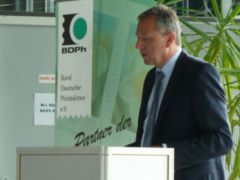 Nach der Begrüßung durch Dieter Hartig sprach Dr. Kurz das Grußwort der Stadt Mannheim. Er hob dabei die großen technologischen Leistungen der Quadratestadt hervor - wurden doch hier 1817 das lenkbare Laufrad von Karl Drais (Draisine), und 1885 das erste Automobil von Carl Friedrich Benz (Benz Patent-Motorwagen Nummer 1) erfunden. Dass der erste Postflug zwischen Mannheim und Heidelberg stattfand, passe sehr gut in diese Tradition. In seinem Festvortrag ging Dieter Hartig auch auf die Entstehung des "Tag der Briefmarke" ein. Der Tag der Briefmarke (TdB) geht auf eine Idee von Hans von Rudolphi zurück und wurde erstmals im Dezember 1935 in Österreich begangen und sollte auf die Bedeutung der Briefmarke für die Post und die Allgemeinheit durch Ausstellungen, Sondermarken, etc. hinweisen.