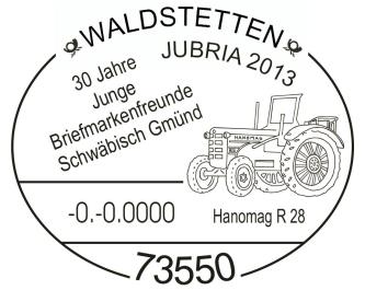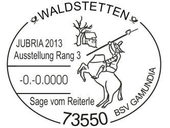 JUBRIA 2013 30 Jahre Jungen Briefmarkenfreunde Schwäbisch Gmünd. Aus diesem Anlass veranstaltet die Jugend mit dem Briefmarkensammlerverein Gamundia 1886 e.V. die JUBRIA 2013. Die Veranstaltung, mit Rang 3 Wettbewerbsausstellung und Jugendklasse, findet am 14. und 15. September 2013 in der Stuifenhalle in Waldstetten (bei Schwäbisch Gmünd) statt.