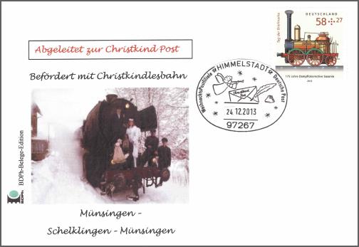 Der Museumsverein Schwäbische Albbahn wird am 24. Dezember 2013 um 11 Uhr und 14 Uhr mit dem Christkindleszügle zwei Fahrten durch das weihnachtliche Schandental von Münsingen nach Schelklingen durchführen. Mit im Zug sind das Christkind und der "Pelz-Märte". Die Sammlerpost wird im Gepäckwagen transportiert, anschließend an die Sonderstempelstelle Himmelstadt weiter geleitet und dann an den angegebenen Empfänger direkt zugestellt. Senden Sie einfach bis zum 20.12.2013 (verlängert) eine E-Mail mit der/den Empfänger-Anschrift(en) (nur Adressen in Deutschland möglich) an info@bdph.de und überweisen Sie 3,00 Euro pro Beleg auf folgendes Konto: Kontoinhaber: Bund Deutscher Philatelisten