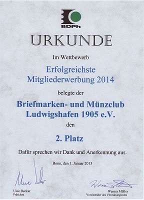 Im Rahmen der Eröffnung des Briefmarken-Campus des Briefmarken- und Münzclub Ludwigshafen 1905 e. V. (BMC) im Rathaus-Center Ludwigshafen am 5. Juni 2015 hatte der 2. Vorsitzende des Landesverbandes Südwestdeutscher Briefmarkensammlervereine e. V. eine besondere Überraschung dabei: Die anwesende Oberbürgermeisterin, Frau Dr. Eva Lohse, zeigte sich von der überzeugenden Leistung des Ludwigshafener Vereins beeindruckt und stellte in ihrer Ansprache die Wichtigkeit der Briefmarke und des Vereins für das kulturelle Leben der Stadt Ludwigshafen heraus. Der Vorsitzende des Vereins, Markus Steuerwald, bedankte sich für die Ehrung und hob die umfangreichen Aktivitäten der Erwachsenen und Jugendlichen im Verein hervor, die die Basis des gemeinsamen Erfolgs seien. Dittmar Wöhlert