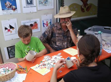 Briefmarkensammeln als völkerverbindendes und integratives Hobby Briefmarkensammeln als Menschen verbindendes Hobby zeigten der BSV Gaildorf und die Jungen Briefmarkenfreunde Gaildorf mit der Teilnahme am Freundschaftstag und der Integrationsmesse am Sonntag, den 14.06.2015. Bei fast schon zu schönem sommerlichen Wetter gab es ein buntes Programm verschiedener Organisationen. Auf dem gaildorfer Hallengelände am Stand 21 wartete ein vielfältiges Angebot auf Kinder und Erwachsene. So konnten 100 Postkarten mit der FELIX-Briefmarke bemalt und auf Kosten des Briefmarkensammlerevereins als kleiner Gruss deutschlandweit verschickt werden. Ein Angebot, das gerne genutzt wurde. Das Bekleben von Bechern mit Briefmarken war ebenfalls ein gefragter Programmpunkt. Seit Beginn dieser Aktionsreihe des Landratsamtes Schwäbisch Hall ist der Gaildorfer Briefmrkensammlerverein mit dabei. Die Veranstaltung findet jährlich wechselnd in Gaildorf, Schwäbisch Hall und Crailsheim statt. Besonders herausgestellt wird dabei immer das Jugendangebot des Vereins, das sich auch an Kinder und Jugendliche mit Migrationshintergrund richtet. Aber auch erwachsene Sammlerinnen und Sammler werden angesprochen. Axel Brockmann Bilder: Bernhard Scheu Internetseite des BSV Gaildorf: www.bsv-gaildorf.de BDPh-Vorbericht unter: www.bdph.de/index.php?&id=93&backPID=1&tt_news=8479&cHash=be01008296