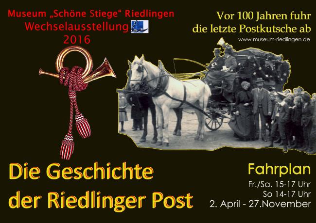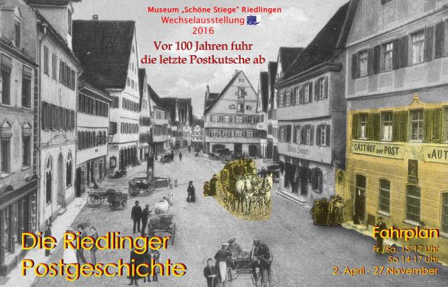 Der Altertumsverein Riedlingen hat im Museum „Schöne Stiege“ für das Jahr 2016 eine Ausstellung über die Geschichte der Riedlinger Post zusammengestellt, an der sich auch verschiedene Sammler des Briefmarkenvereins Riedlingen beteiligen (Links: www.bsv-riedlingen.de/?p=555). Die Ausstellung wird am Freitag, 1. April 2016, 19.00 Uhr in der Kreissparkasse in Riedlingen offiziell eröffnet und ist bis zum 27. November 2016 zu sehen.