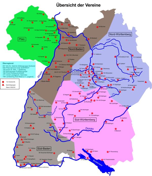 Welcher Verein welcher Region angehört, kann jetzt auf der Internetseite des Landesverbandes unter "Regionen" eingesehen werden. Auf der Regionen-Startseite ist jetzt eine neue Südwest-Landkarte mit den aktuellen Regionen in verschiedenen Farben zu finden. Gerade durch die eingezeichneten Gewässer (Flüsse/Bodensee) wird eine bessere Orientierung gegeben. Die Seiten der einzelnen Regionen -ebenfalls mit neuen Klein-Landkarten- sind weiter durch Text-Links und durch Klicken auf die Region in der Karte erreichbar. In den Regionen-Seiten sind rechts die jeweiligen Mitgliedsvereine gelistet. Die überregionalen Vereine, die durch ihren Hauptsitz den Regionen zugeordnet sind, sind unten in der Liste zu finden. Klickt man die Vereine an, kommt man zum Eintrag des jeweiligen Vereins in der Liste "LSW-Vereine". Hier werden die genauen Daten und Kontaktmöglichkeiten aufgezeigt. Auf der Startseite der Regionen sind nun zwei PDF-Dateien zu finden, die man sich ausdrucken / herunterladen kann. Es ist die Regionenliste und die Landkarte des LSW mit eingezeichneten Vereinen und Sammlergruppen. Besonderen Dank gilt Klaus Riebauer, der die Landkarten in mühevoller Kleinarbeit in Zusammenarbeit mit Dittmar Wöhlert erstellt hat. Detlev Moratz |