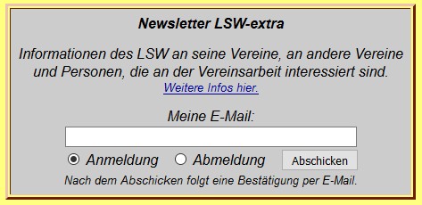 Im ersten Newsletter-Verteiler "LSW-extra" sind nun alle über das Mitglieder-Verwaltungsprogramm DIVA eingetragenen E-Mail-Anschriften der 1. Vorsitzenden, der Kontaktpersonen und der Mitgliederverwalter angemailt worden, ebenso die Vorstandsmitglieder des Landesringes Süd-West (Jugend). Ziel ist es, alle Vorstandsmitglieder der Vereine in Südwest aufzunehmen, sowie Personen, die an der Vereinsarbeit interessiert sind.