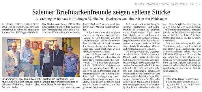| Ausstellung von Briefmarken, Ansichtskarten und Münzen im Rathaus Uhldingen-Mühlhofen bis 28.10.2016