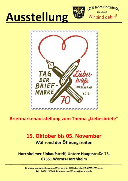 Dem Thema "Liebesbriefe" widmet sich eine Ausstellung des Briefmarkensammlervereins Worms vom 15. Oktober bis 5. November 2016 (während der Öffnungszeiten) im Horchheimer Einkaufstreff, Untere Hauptstraße 73, 67551 Worms-Horchheim. Bericht der Wormser Zeitung von 18.10.2016: