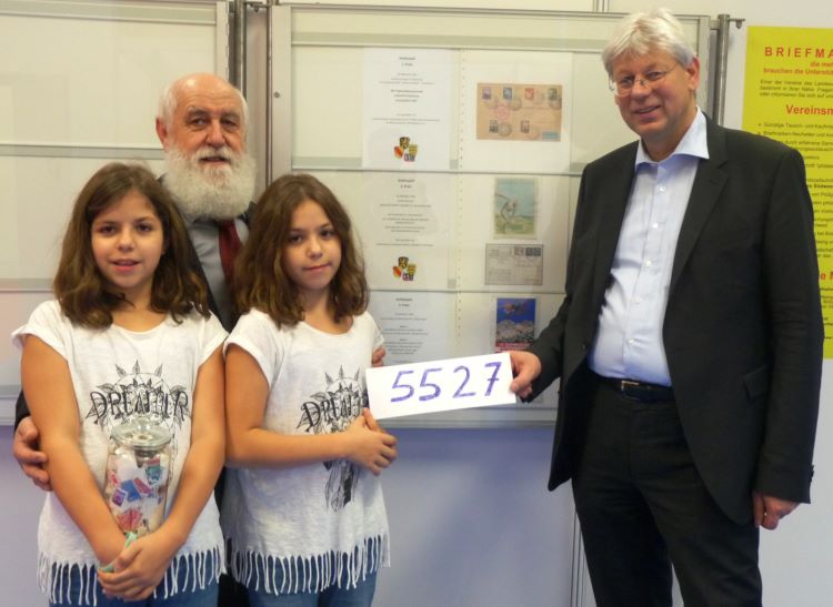Zunächst wurden noch auf der Messe am Samstagnachmittag die Briefmarken, unter "jugendlicher Aufsicht", gezählt, denn niemand wusste bis dahin wirklich wieviele Marken in Glas waren. Dann wurden die Gewinner ermittelt. Platz 1 und 2 mussten ausgelost werden, da beide jeweils 5555 Stück geschätzt hatten. Auch bei Platz 3 musste gelost werden, da zwei Schätzungen mit 5700 Stück vorlagen.