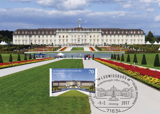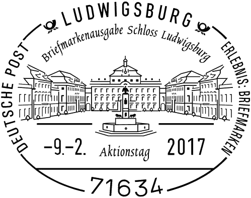 | Ab 9. Februar 2017 bundesweit an den Postschaltern: Schloss Ludwigsburg Vom 9. bis 11. Februar sind die Briefmarkenvereine Ludwigsburg und Remseck sowie die Deutsche Post mit einem Sonderstempel im Schloss vertreten.