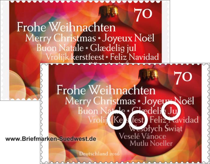 | Das Sammelgebiet Deutschland ist um eine unverausgabte Marke reicher: Die Weihnachtskugel-Marke 2016 mit Rechtschreibfehlern. Am 2. November 2016 sollte die zuschlagsfreie Sondermarke "Weihnachtskugel" erscheinen. Kurzfristig wurde die Marke (nassklebend und selbstklebend im Zehner-Markenset) nicht ausgegeben, wegen drei Rechtschreibfehlern. Jetzt sind die ersten Unverausgabten aufgetaucht! "Frohe Weihnachten" wurde auf dem Motiv in neun weiteren Sprachen wiederholt. Bei der dänischen und der niederländischen Schreibweise gab es Probleme: Glædelig Jul, statt Glædelig jul.