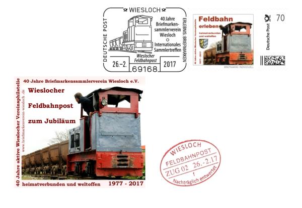 Wieslocher Feldbahnpost zum Jubiläum 1977 - 2017 - 40 Jahre Wieslocher Vereinsphilatelie - heimatverbunden und weltoffen. Zu keiner Zeit hat es in Deutschland eine Feldbahnpost gegeben - bis jetzt. Der Briefmarkensammlerverein Wiesloch wird das zu seinem 40-jährigen Bestehen nun ändern. In Zusammenarbeit mit dem Feldbahn- und Industriemuseum Wiesloch schicken die Sammlerfreunde am 26. Februar 2017 Briefe auf die Reise. Anlass ist das 39. Internationale Kurpfälzer Sammlertreffen. Immerhin fast zwei Kilometer lang ist die Strecke, die mit der historischen Feldbahn zurückgelegt wird. Eine längere Fahrstrecke ist auch schon in der Planung.