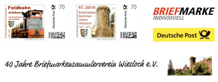 Zusätzlich wird vom Briefmarkensammlerverein Wiesloch noch eine weitere Briefmarke Individuell mit passendem Beleg herausgegeben mit dem Thema "1977 - 2017, 40 Jahre aktive Vereinsphilatelie, heimatverbunden und weltoffen".