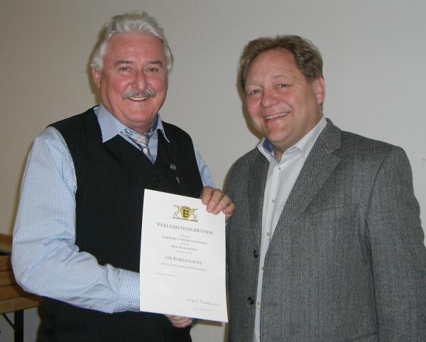 erhält die Ehrennadel und die Urkunde vom