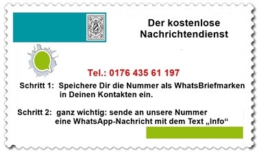 Es funktioniert ganz einfach: Wenn Sie WhatsApp auf dem Smartphone installiert haben, speichern Sie die Telefonnummer 0176 435 61 197 unter dem Namen WhatsBriefmarken ab. Anschließend schreiben Sie über WhatsApp - WhatsBriefmarken eine Nachricht mit „Info“ – fertig. Somit erhalten Sie bei der nächsten Aussendung die neusten Informationen.