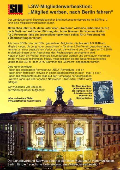 Mitmachen lohnt sich, denn unter allen „Werbern“ wird eine Bahnreise (2. Kl.) nach Berlin mit exklusiver Führung durch das Museum für Kommunikation für 2 Personen (falls ein Jugendlicher gewinnen sollte: für 3 Personen) mit 2 Übernachtungen verlost.