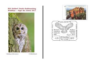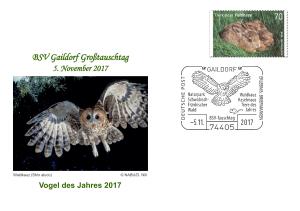 Am ersten Novemberwochende ist es wieder soweit: Der Gaildorfer Ostalbgroßtauschtag öffnet am 5. November 2017 im Kernersaal der Limpurghalle seine Pforten. Von 9 - 16 Uhr können begeisterte Sammler von Briefmarken, Münzen, Ansichtskarten und anderen philalistischen Schätzen das passende Stück für Ihre Sammlung finden. Ein reichhaltiges Angebot von Händlern aber auch die Möglichkeit von Tausch und Plausch machen den gaildorfer Großtauschtag seit Jahren zum beliebten Treffpunkt für Sammler aus ganz Nordwürttemberg und dem angrenzenden Bayern. Das Erlebnis-Briefmarken Team aus Pforzheim ist auch wieder mit dabei und hat im Gepäck wieder einen Sonderstempel mit dem Vogel des Jahres. Neben dem Waldkauz ist auch dessen beliebte Jagdbeute, die Haselmaus abgebildet, ebenfalls ein Tier des Jahres 2017. Beide Tiere passen auch gut in die Region: Gaildorf liegt am Rand des Naturparks Schwäbisch-Fränkischer Wald. Ebenfalls mit dabei ist die NABU-Ortsgruppe Gaildorf, die über Tier- und Naturschutz im Limpurger Land informiert. Passend zum Stempel bietet der Verein wieder eine Ganzsache und einen Sonderumschlag an.