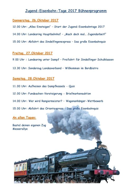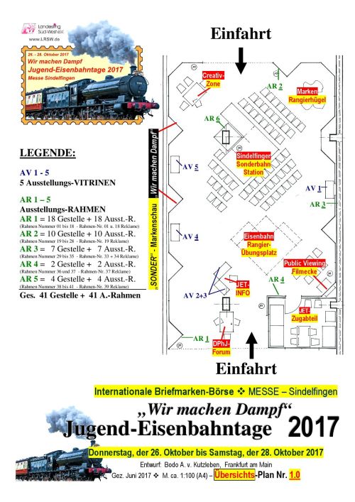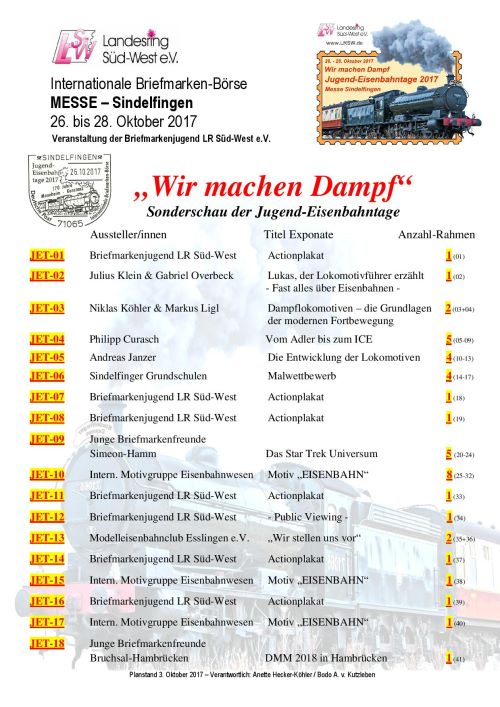 Wie in den letzten Jahren bereits praktiziert, findet der Empfang des Landesverbandes ebenfalls im Jugendbereich unter dem Motto "Sonderzug Landesverband - Willkommen im Bordbistr" am Freitagmittag (27.10.2017) um 13.30 Uhr statt. Am Donnerstag (26.10.2017) um 14.00 Uhr können sich alle interessierten Sammler beim Vortrag Landesring-Hauptbahnhof - "Mach doch mal Jugendarbeit" über die Arbeit des Landesrings und der DPhJ informieren. Auch besteht dann die Möglichkeit, die neuen Materialien zur Gruppenarbeit direkt zu begutachten. Als besondere Überraschung gibt es für alle jungen und junggebliebenen Eisenbahnfans eine Eisenbahnmodell-Anlage des Modelleisenbahn-Club Esslingen. Auf knapp drei Quadratmetern kann das Rangieren im Mini-Format geübt werden. Ferner hat Philipp Curasch freundlicherweise aus seiner Privatsammlung zahlreiche Bahnutensilien zur Verfügung gestellt. So verwandelt sich der Jugendbereich auch in ein kleines Eisenbahnmuseum, das besondere Ausstellungsstücke wie ein Formsignal, ein Zuglaufschild, eine Schlussleuchte und eine Rangierlampe zum Erleben und Staunen bereit hält. Bilder siehe: www.lrsw.de/?p=1374 Das Angebot im Jugendbereich wird durch ein Bastelangebot abgerundet: Es werden - natürlich - Züge gebastelt. Diese und weitere Informationen sind zur besseren Orientierung unter www.lrsw.de zu finden. Landesring Süd-West der DPhJ e. V. Schatzmeister Homepage: www.lrsw.de
