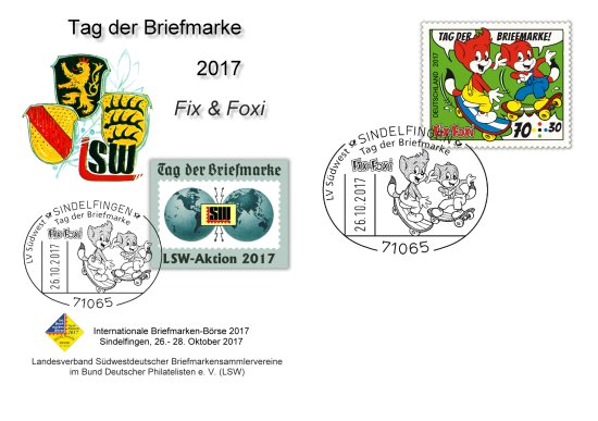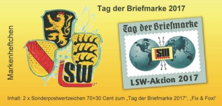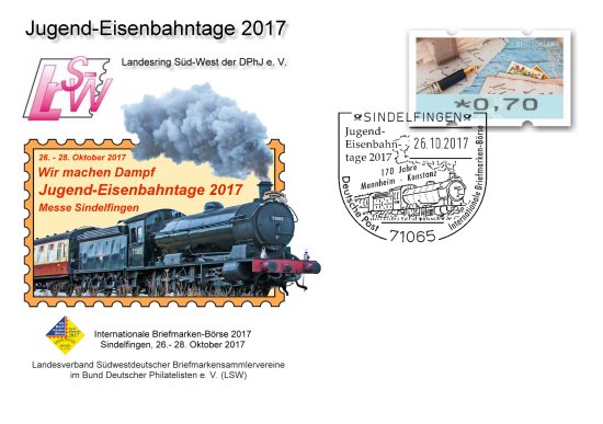 Drei Sonderstempel in Sindelfingen. Belege und Markenheftchen des LSW ! Die Internationale Briefmarken-Börse Sindelfingen 2017 bietet in diesem Jahr drei Sonderstempel über alle drei Tage hinweg. Zudem unterhält der Landesverband einen Stand unten in Parterre, gleich rechts nach dem Eingang in die Halle.