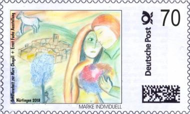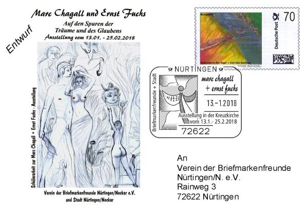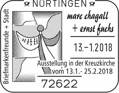 Es ist nun schon das 11. Mal, dass sich die Briefmarkenfreunde Nürtingen/N. an den Kunstausstellungen in der Nürtinger Kreuzkirche beteiligen. Die diesjährige findet vom 13.01. – 25.02.2018 statt und ist den beiden Künstlern Marc Chagall und Ernst Fuchs gewidmet. Beide scheinen auf den ersten Blick wenig gemeinsam zu haben und man fragt sich, was wohl das Motiv ist um sie beide in einer Ausstellung zusammenzuführen. Der berühmte Maler Marc Chagall (*1887, V 1985) war weißrussisch-jüdischer Herkunft und lebte in Paris, später in den USA. Hingegen verbrachte der deutlich jüngere Ernst Fuchs (*1930, V 2015) seine Zeit fast ausschließlich in Österreich. Was sie aber eint, ist die Thematik ihrer Bilder, denn es geht immer um Stimmungen, Träume und Visionen, die malerisch umgesetzt werden. Insofern dürfte es spannend sein, die Werke der beiden einem Vergleich zu unterziehen. Begleitend zu dieser Werkschau gibt es wieder verschiedene Sonderumschläge, einen Sonderstempel sowie zwei individuelle Briefmarken (Portowert € 0,70). Die Bildmotive dafür entsprangen einem Wettbewerb, an dem sich vier Nürtinger Schulen beteiligten und mit dem bei den Schülern und Schülerinnen nicht nur Interesse am Œuvre der beiden Künstler sondern nebenbei auch an der Philatelie geweckt wurde. Diese überraschend gut gelungenen Arbeiten werden in der gegenüber der Kreuzkirche gelegenen Kreissparkasse während der Dauer der Kunstausstellung zu den üblichen Banköffnungszeiten zu besichtigen sein.