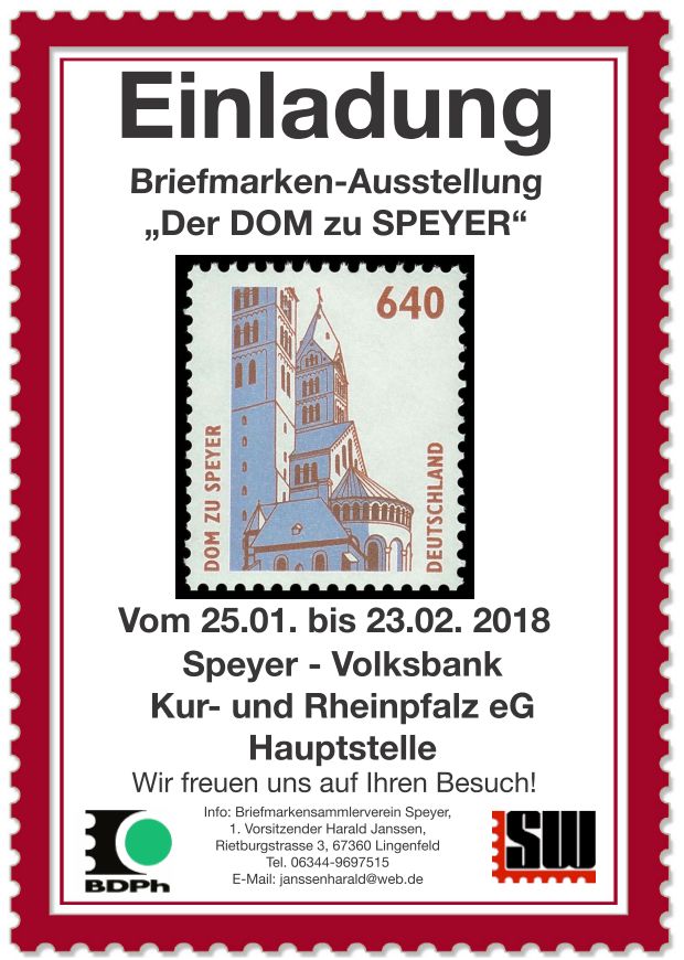 | Briefmarkenausstellung "Der Dom zu Speyer". In der Volksbank Kur- und Rheinpfalz eG / Dialogzone, Bahnhofstraße 19, 37346 Speyer. Der Eintritt ist frei.
