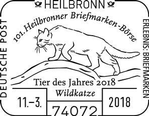 | 101. Heilbronner Briefmarken-Börse mit Sonderstempel "Tier des Jahres" Mit der 101. Heilbronner Briefmarken-Börse, die am Sonntag, den 11. März 2018, von 9.00 Uhr bis 16.00 Uhr in der Festhalle Harmonie (Allee 28, 74072 Heilbronn) stattfindet, wird die Sonderstempelserie "Tier des Jahres" fortgesetzt. Das "Tier des Jahres" ist 2018 die Wildkatze. Das "Team Erlebnis Briefmarken" der Deutschen Post ist vor Ort und schlägt diesen Sonderstempel ab: