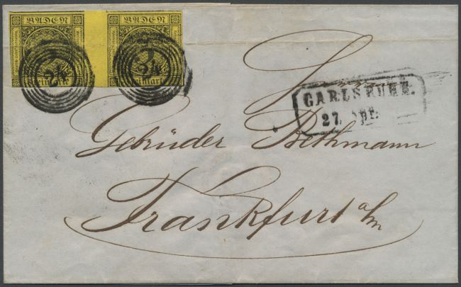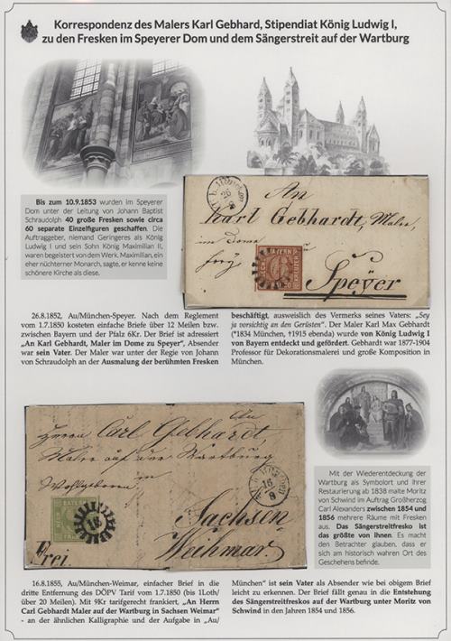 Ausstellung der Sammlung "BAYERISCHE BRIEFPOST IM SPIEGEL DER SOCIAL PHILATELIE" (Los-Nr. 726, Ausruf 160.000 €) im Schlosshotel Monrepos 1806/1875: Eine Sammlung von über 100 ganz aussergewöhnlichen Briefen oder Belegen, dabei fast jeder auf seine Art einmalig, entweder Aufgrund seiner Frankatur, einer aussergewöhnlichen postalischen Verwendungsform oder mit royaler bzw. berühmter Personlichkeiten als Absender/Empfänger-Adresse, beginnend mit einer Einzelfrankatur eines Schwarzen Einsers sowie eines Portobriefes vom Marken-Ersttag.