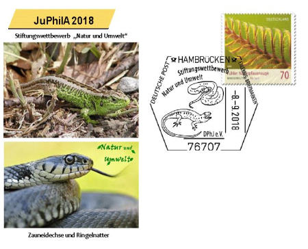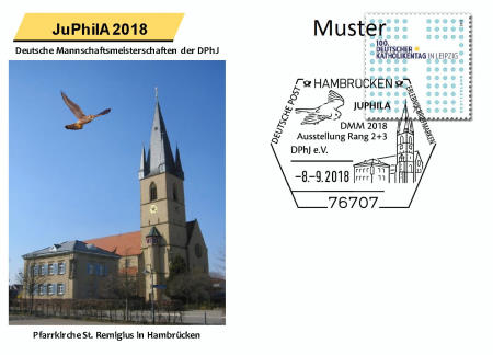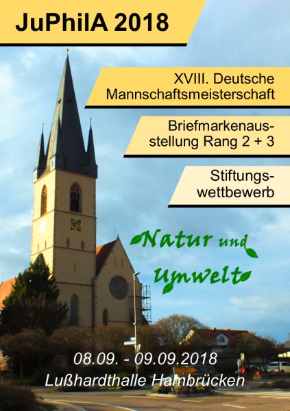 Am 8. und 9. September 2018 findet in der Lußhardthalle, Hambrücken (bei Bruchsal), die Deutsche Mannschaftsmeisterschaft der DPhJ statt. Begleitend dazu findet eine Rang 2/3-Ausstellung der Jugend sowie der Stiftungswettbewerb statt. Die gesamte Veranstaltung der JuPhilA 2018 steht unter dem Motto „Natur und Umwelt“ und wird am 08.09.2018 um 10 Uhr von Bürgermeister Thomas Ackermann eröffnet. Ausrichter sind die Jungen Briefmarkenfreunde Bruchsal-Hambrücken unter der Leitung von Anette Hecker-Köhler. Zu den Deutschen Mannschaftsmeisterschaften treffen sich die qualifizierten Teams aus Bayern, Sachsen-Anhalt, Mittelrhein und Südwest und müssen in mehreren Wettbewerbsteilen ihr philatelistisches Geschick und Wissen unter Beweis stellen. Das Team mit den meisten Punkten gewinnt die „Meisterschale“ und darf den Titel „Deutscher Mannschaftsmeister 2018“ tragen. Die Siegerehrung findet am 09.09.2018 um 11:30 Uhr statt. Das Thema „Natur & Umwelt“ wurde nicht zufällig gewählt. Es findet sich nicht nur in den beiden Sonderstempeln, die die Sonderpostfiliale für alle Besucher bereithält, sondern auch in den Schmuckumschlägen, die die Jugendgruppe anbietet, wieder. Das erste Motiv zeigt den Kirchturm von St. Remigius in Hambrücken mit einem Turmfalken und stellt so den besonderen Lebensraum dieses Vogels dar. Auch mit seiner beheimateten Fledermauskolonie eignet sich der Kirchturm ideal als Werbeträger für das Jugend-Event des Jahres.