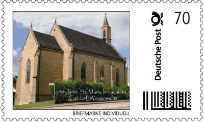 Mit zwei eigenen Briefmarken (Marke Individuell) würdigt der Gaildorfer Sammlerverein das 150. Jubiläum der katholischen Kirche in Winzenweiler, einem Teilort von Gaildorf. Immerhin hatte diese Kirche bereits einem "hohen Besuch": Pius XII., war nicht nur Gaildorf ein Begriff, sondern auch Winzenweiler, der kleine katholisch geprägte Vorort der überwiegend protestantischen Stadt. So zeigt der Bogen mit 20 Marken jeweils eine Marke mit dem späteren Papst und eine Marke die Kirche. Axel Brockmann, Briefmarkensammlerverein Gaildorf e.V. |