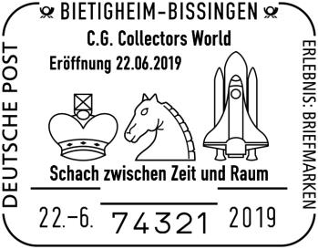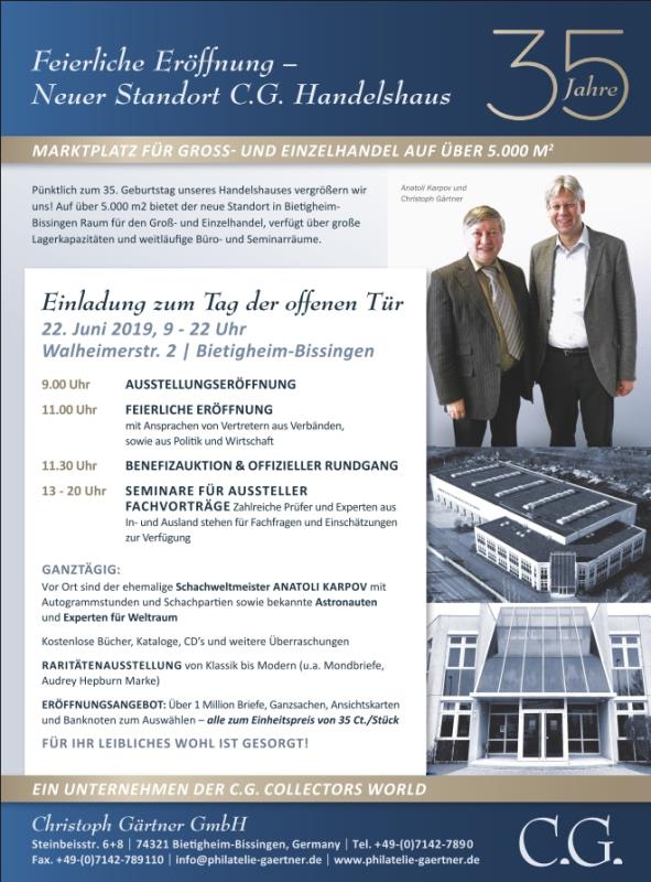 Am Samstag, den 22. Juni 2019, eröffnet Christopf Gärtner offiziell das neue Domizil in der Walheimerstraße 2. Der Landesverband Südwest ist mit einem Stand verteten. Mehrere Vereine aus der Region haben ihre Unterstützung zugesagt. Eine große Briefmarken-Ausstellung erwartet die Gäste. Mit dem 35jährige Firmenjubiläum erhält das Handelshaus neue große Räumlichkeiten und Lagerkapazitäten. Das Auktionshaus bleibt in dem 2005 eröffneten Gebäude im Gewerbegebiet Laiern von Bietigheim-Bissingen bestehen. Unter dem Motto „SCHACH ZWISCHEN ZEIT UND RAUM“ wird ein spannendes Eröffnungsprogramm zum Thema Schach, Weltraum und Philatelie erwartet: Die Dt. Post kommt mit einem Sonderstempel "Schach zwischen Zeit und Raum". Helfer folgender Vereine wirken mit: Den Ablauf des Tages entnehmen Sie bitte der Info: