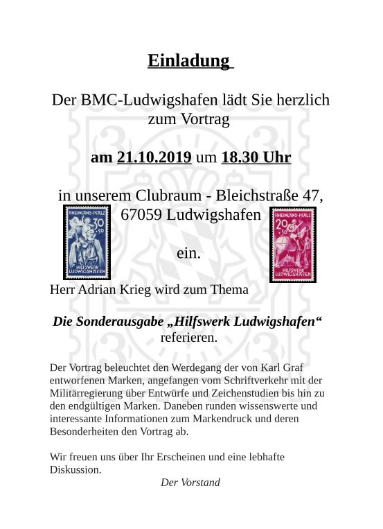 | Die Sonderausgabe „Hilfswerk Ludwigshafen“ Der BMC-Ludwigshafen lädt ein zum Vortrag am 21.10.2019 um 18.30 Uhr im Clubraum - Bleichstraße 47, 67059 Ludwigshafen. Eintritt frei. |