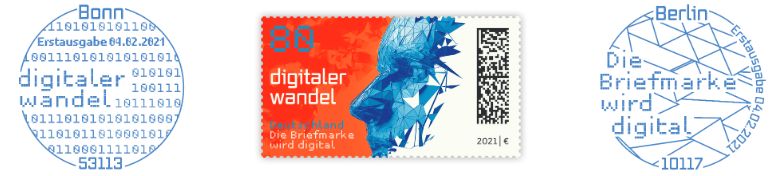 Die erste Marke ist die Ausgabe "Digitaler Wandel". Ersttagssonderstempel aller Sondermarken (auch ohne Matrix-Code) ab dem 4.2.21: BLAU.
