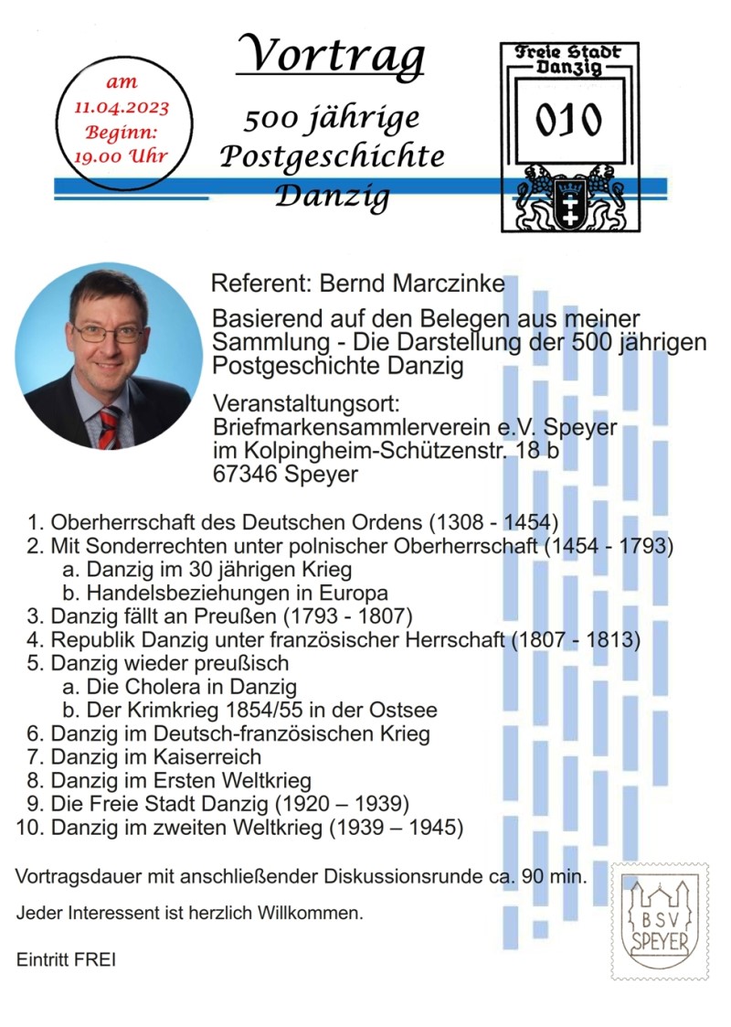 | Vortrag 11.04.2023: "500-jährige Postgeschichte Danzig" Der Briefmarkensammlerverein Speyer veranstaltet am 11. April 2023 einen kostenlosen Vortrag zur 500-jährigen Postgeschichte von Danzig. Jeder Interessent ist herzlich willkommen. Zum Ablauf: