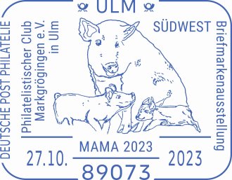 Passend zu den Marken bietet sich der Sonderstempel in Ulm zur MAMA 2023 und der Schweine-Briefmarkenausstellung an.