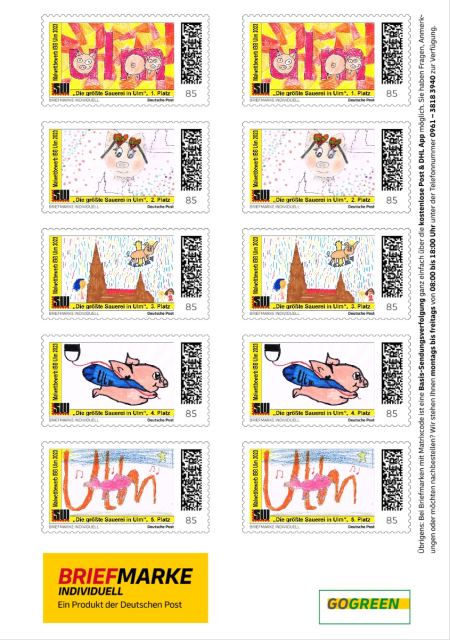 Ein Bogen enthält zehn Marken zu je 85 Cent. Je Gewinner-Bild zwei Marken.