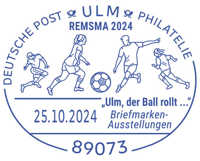 Passend zu den Marken bietet sich der Sonderstempel in Ulm zur Briefmarkenausstellung REMSMA 2024 mit den Fußballern an.
