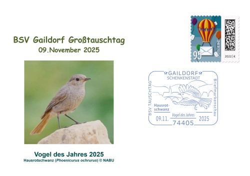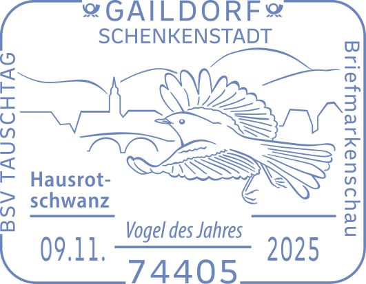 Gaildorfer Großtauschtag am 9. November 2025 mit Sonderstempel zum Vogel des Jahres Die Schenkenstadt Gaildorf ist wieder Austragungsort des Gaildorfer Tauschtags. Sammler aus Nordwürttemberg und dem angrenzenden Bayern nutzen die vielfältigen Angebote für Sammler: Briefmarken, Ansichtskarten, Münzen und Telefonkarten sind hier ein gefragtes Sammelgut. In der Gaildorfer Limpurghalle wartet am Sonntag, den 09.11.2025, aber nicht nur ein breites Handelsangebot und eine Briefmarkenschau auf die Besucher. Informationen rund um das Briefmarken- und Münzsammeln bietet auch der Landesverband Südwestdeutscher Briefmarkensammler und der ausrichtende Briefmarkensammlerverein Gaildorf. Mit dabei ist auch die Deutsche Post. Umschläge mit dem Sonderstempel Vogel des Jahres können erworben und Post verschickt werden. Viele gute Gründe für einen Abstecher nach Gaildorf. Der Sonderstempel zeigt den Hausrotschwanz im Flug über die historische Stadtansicht. Er setzt die Reihe von Stempeln mit dem Thema "Vogel des Jahres" fort. Mit dabei ist auch die Ortsgruppe Gaildorf des NABU. An deren Stand gibt es Informationen rund um Naturschutz und andere Umweltthemen. Am Stand abgegebene Post erhält den Sonderstempel. Der Sonderumschlag kann auch postalisch bestellt werden. Interessenten wenden sich an Joachim Rupp, Prescherstraße 38 in 74405 Gaildorf. Dort sind auch noch einzelne Stempel der Vorjahre erhältlich. Die Briefmarkenschau ist gleichzeitig Vereinsmeisterschaft. Teilnehmen können alle Mitglieder des Vereins von der Jugendgruppe bis hin zu den erwachsenen Sammlern. Die Jugendgruppe ist ebenfalls aktiv mit dabei und informiert junge Briefmarkenfreunde über das Hobby Briefmarkensammeln und ihre Angebote. Die gleichzeitig stattfindende Kirbe mit verkaufsoffenem Sonntag bietet auch Begleitern einen angenehmen und abwechslungsreichen Aufenthalt in Gaildorf. Gaildorf ist verkehrsgünstig an der B 19 gelegen und von Heilbronn, Würzburg, Nürnberg, Donauwörth, Ulm oder Stuttgart in rund einer Stunde zu erreichen. Parkplätze sind bei der Limpurghalle kostenfrei verfügbar. Bahnreisende nutzen den Bahnhof Gaildorf-West (Strecke Stuttgart - Schwäbisch Hall - Crailsheim - Nürnberg) und erreichen die Limpurghalle im Ortszentrum mit einem kleinen Spaziergang. Während der Öffnungszeiten von 9 - 16 Uhr warten auch die guten schwäbischen Maultauschen mit Kartoffelsalat und ein breites Angebot an Kuchen auf die Besucher. Gaildorfer Tauschtag Briefmarken - Münzen - Ansichtskarten - Sonderstempel 09.11.2025: 74405 Gaildorf, Limpurghalle, Schloss-Straße 11 9.00 - 16.00 Uhr